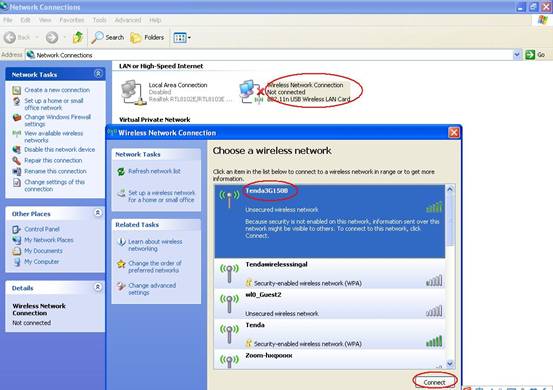 Please find the name of your wireless network (it is SSID tenda123) and connect to it. It will require you to input password, please type password (It is the key which was made by yourself just now.) After that, you can enjoy the internet wirelessly.