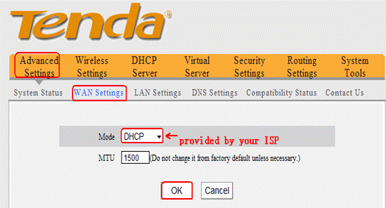 2. Click Advanced SettingsàWAN settings, in the drop down menu of Mode, please choose the internet connection type of yours (if you don’t know which one you should choose, please consult Cable Company) as the picture below. And click Ok to save the settings.
