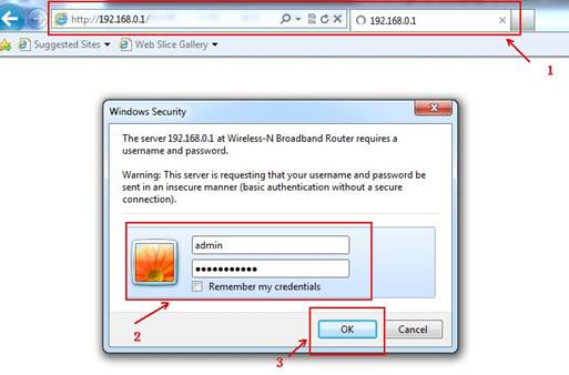 192.168.0.1 in the address bar of your web browser (IE, Firefox, etc.), and a pop-up will appear to require you to input username and password. The default username and password both are admin, please click ok to login.