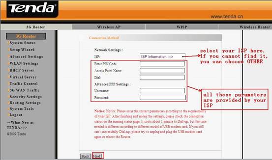 5. Please input the parameters which you have recorded from your 3G modem in this page and click Next button.