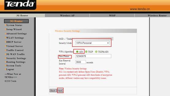 7. Then you are in the Wireless Security Settings page where you can set a password for your wireless network. Please select WPA-Personal as the security mode and AES as the WPA Algorithms, then input at least 8 characters, numbers of letters, in the Pass Phrase. Click Next.
