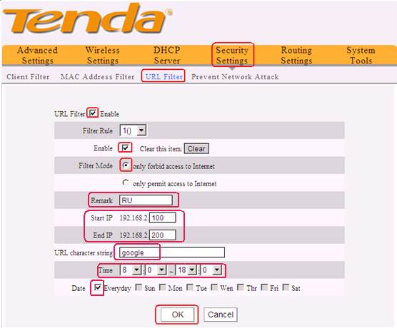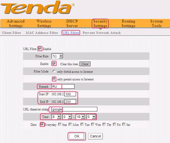 For example, you want to block the computers whose IP Address is 192.168.2.100 - 192.168.2.200 to access the websites that include “Google” from 8:00 am to 18:00 pm every day. And the computer with other IP address can access Internet. You can set the router following the picture as below.