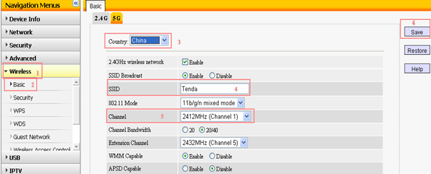 4、Now you are in the homepage of your R1,please click Wireless on the left menu,then click Basic choose 2.4G choose country change the SSID(for example: Tenda)find Channel(choose channel 1)àclick Save.