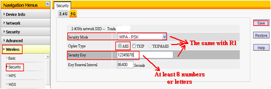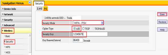 click on Wireless on the left menuàSecurityàchoose 2.4Gàchoose WPA –PSK as Security Modeàchoose AES as Cipher TypeàSecurity Key(for example:12345678) àclick Save