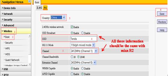 2、 please click Wireless on the left menuàclick Basicàchoose 2.4G àchoose country àchange the SSID(same with R1:Tenda)àfind Channel(same with R1)àclick Save.