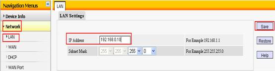 4、click Network,then click LAN , change the IP Address to a new one but the same segment of 192.168.0.1, e.g. 192.168.0.10.Then Save it, and the router will reboot.