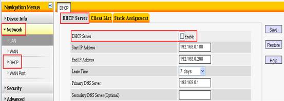 5、Click Network and choose DHCP ,then DHCP Server, please choose uncheck.