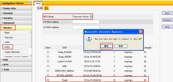 6、Please go back to Wireless and choose WDS ,then choose Repeater Mode as WDS mode, and “open scan” to search the SSID of R1 and connect it.