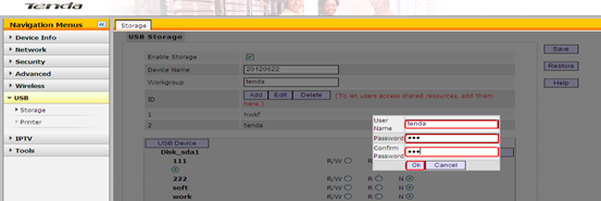2、Click Add to create an account, and enter a Username and Password, which will used by clients when accessing the USB storage device for sharing file. Retype to confirm password and then click OK to save it.