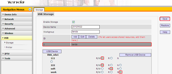Ⅲ, 1、Click USB→Storage, then check enable Storage to enable the file sharing. And type Device name and Work group.