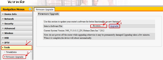 Ⅴ,click Tools→Firmware Upgrade on the left side, then click Browse to Locate and select the firmware, then click Upgrade to upgrade the firmware for the router. The router will reboot after finish upgrading.
