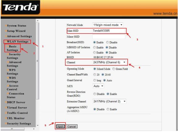 (2) Then click WLAN settingsàBasic settings to change the SSID to TendaW330R and choose channel 6, then click Apply.