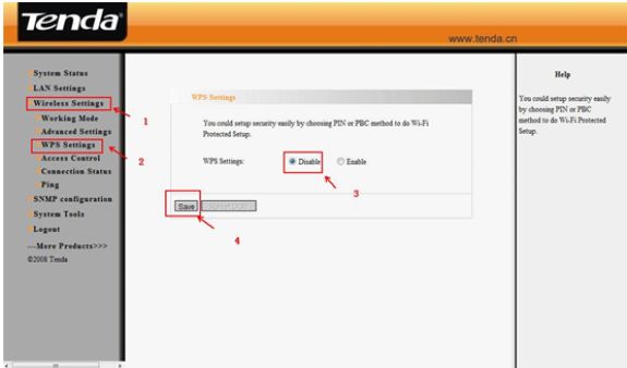 4. Please click on Wireless SettingàWPS Settings to disable the WPS, then click on save.