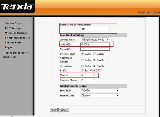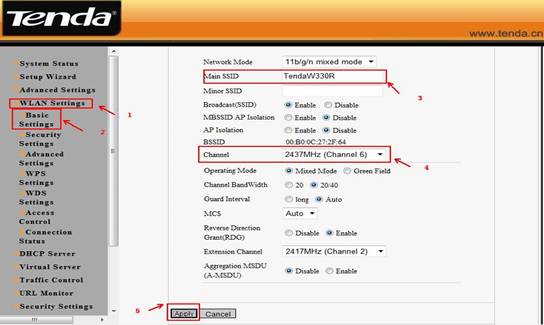 (2)After successful login, please click WLAN settingàBasic setting to change the SSID to tendaW330R, and choose channel 6. Then click Apply to save the setting.