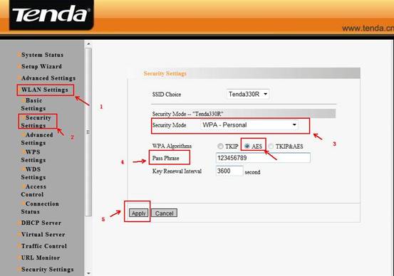 (3) Then click WLAN Settingà Security Setting to choose WPA-personal as security mode and select AES as WPA Algorithms, please type your password in the blank of Pass Phrase.