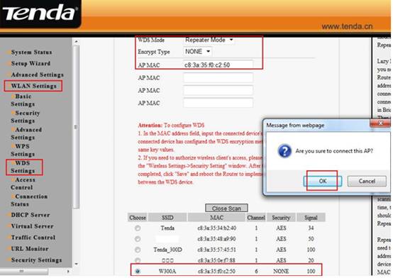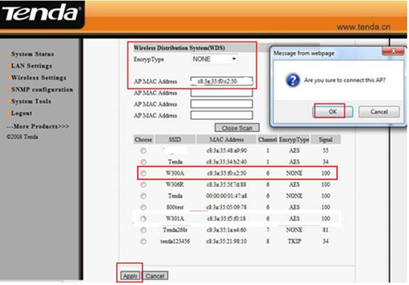 (1). Then change your SSID, choose channel 6 and the WDS Encrypt Type should be the same as your uplink AP1 (all the configurations should be the same as your uplink AP1), then click on open scan and choose your uplink AP’s signal, then click on ok. Don’t forget to click Apply. The W300A will reboot.