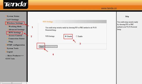3. Please click on Wireless SettingàWPS Settings to disable the WPS, then click on save.