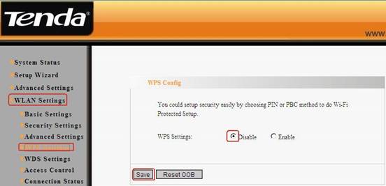 4. Then click WLAN settingà WPS settings to choose Disable to disable the WPS, click Apply to save the setting.