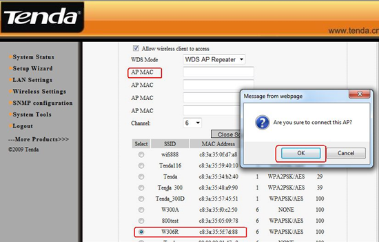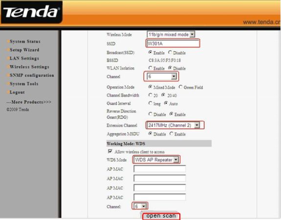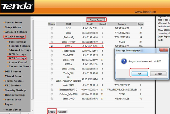 6. Go back to your uplink router’s management page, and click WLAN settingàWDS settings. Please choose Repeater Mode as WDS Mode, then click Open Scan, find and tick the signal of W301A. After click OK you can find the MAC address added in the blank of AP MAC. Click on Apply to save, and then the router will reboot.