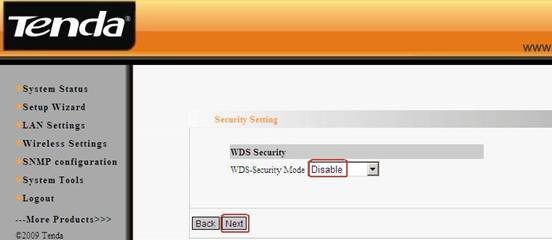 4. In the Security settings, disable the WDS-security. And then click Next.