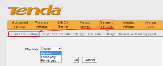 2. Click Security SettingsàClient Filter Settings, you will find the page as below. There are three options (Disable, Forbid only, and Permit only). The client filter is disable in default.