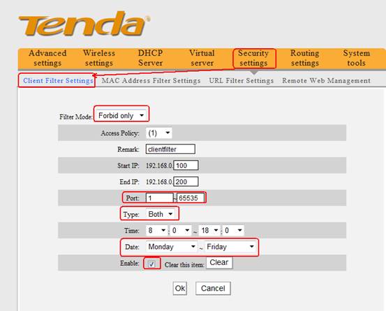 For example, we want to limit the computer with IP address during 192.168.0.100~192.168.0.200 to access the internet from 8:00am to 18:00pm from Monday to Friday. And the computers with other IP Addresses can access internet. You can set the router following the picture as below.