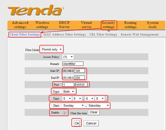 For example, we only want the computer with IP address (192.168.0.100~192.168.0.200) to access the internet and others can’t access Internet. You can set the router following the picture as below.