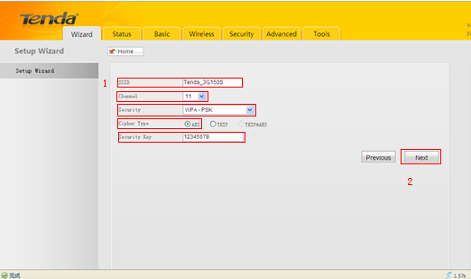 7. In the new page, the SSID is a name of the 3G150S signal (you can change it to another name as you like), please choose 6 as the Channal ,choose WPA-PSK as Security,choose AES as Cipher type. The Security Key is the wireless password,you can set a password here (if you have changed it, please use the new password to reconnect to the 3G150S). Hit on Next.