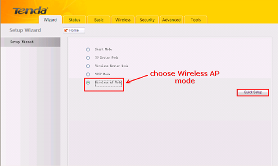 6. After that, you can login to the management page of the 3G150S, in the new page, please choose Wireless AP Mode and hit Quick Setup.
