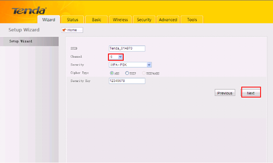 7. In the new page, the SSID is a name of the 3G150S signal (you can change it to another name as you like), please choose 6 as the Channal ,choose WPA-PSK as Security,choose AES as Cipher type. The Security Key is the wireless password,you can set a password here (if you have changed it, please use the new password to reconnect to the 3G150S). Hit on Next.