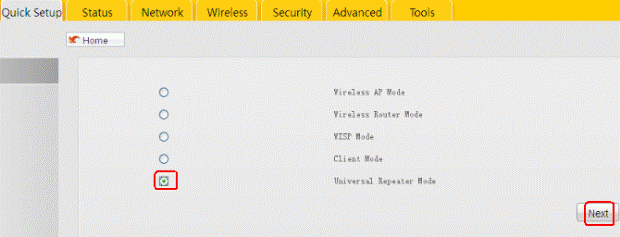 3. Click Quick Setup->Universal Repeater Mode and click Next