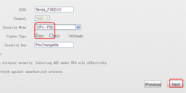 5. In the following page, you can change the SSID(the name of your WiFi, please select the same Security Mode and Cipher Type as your uplink router, then set an at least 8 character’s Security Key for your WiFi.
