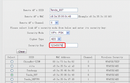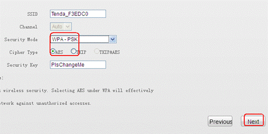 5. In the following page, you can change the SSID(the name of your WiFi, please select the same Security Mode and Cipher Type, then set an at least 8 character’s Security Key for your WiFi.