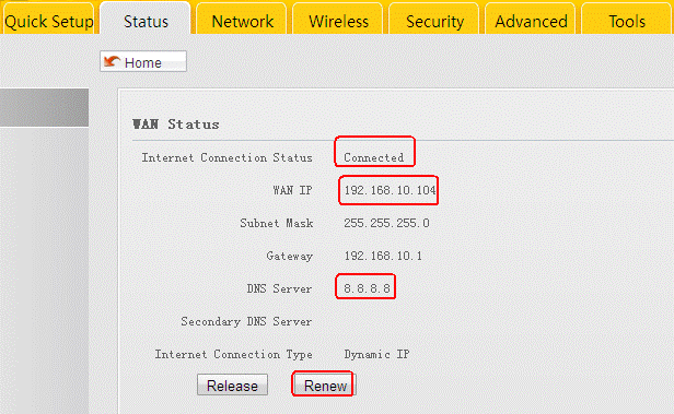 8. Click Status to check the Internet Connection Status, if it shows Connected, it means that you have setup WISP mode successfully. If not, please click on Renew for several times.