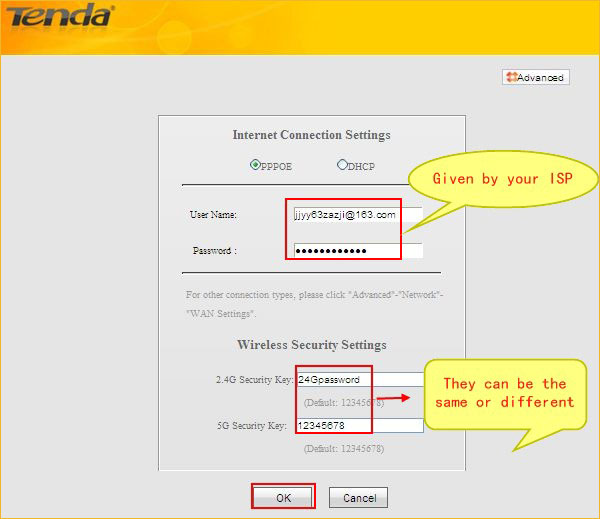 2. Choose PPPoE, input the information, set the security key (wireless password), click OK.
