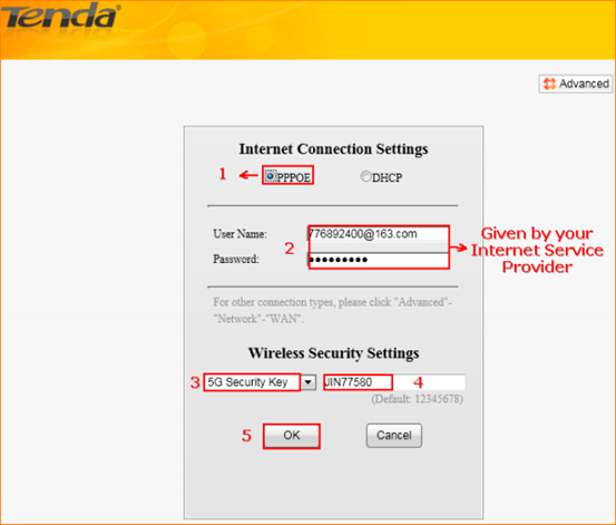 3. Choose PPPOE,fill in the username and password, select 2.4G Security Key, then set an 8 character security key (wireless password) for it, Select 5G Security Key, then set the security key for it, too. The security key for 2.4G and 5G can be the same or different. Click OK to save the settings.