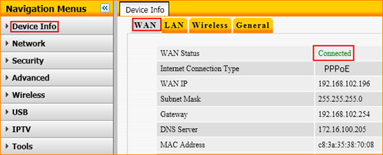 2. Clone MAC Address ,then click Save as the following picture and then go back to Device Info to check WAN Status.