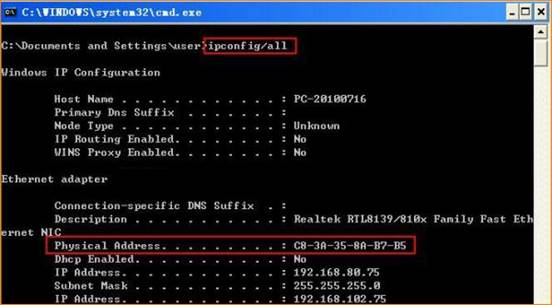 Type ipconfig /all at the prompt window, press Enter, it will show the MAC address and other address information of this computer.