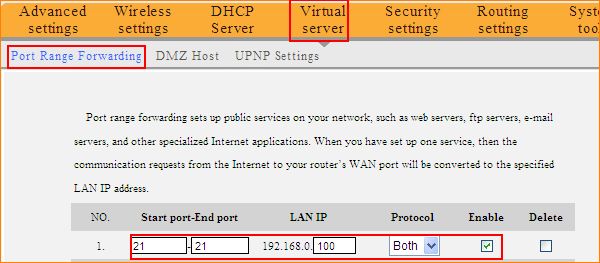 As the following picture, I want to do port range forwarding for my FTP Server so that other people on the Internet can access my FTP Server.