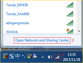 1 Click Network Connection Icon on the system tray, then click Open Network and Sharing