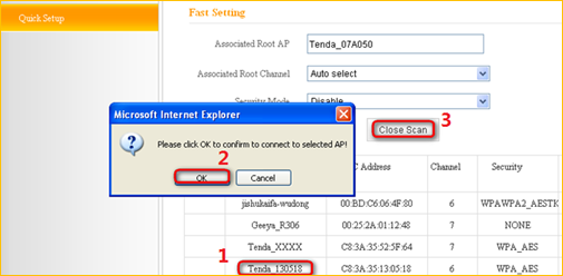 2Click Open Scan, select the remote router's wireless network (SSID), say Tenda_130518,