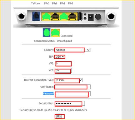 Note: If you have no idea about what is the internet connection type, VPI/VCI value, the accounts please call your ISP for them.