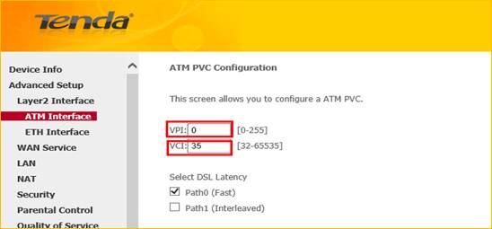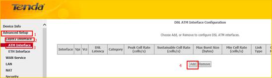 3 Click Advanced—Advanced Setup-Layer2 interface- ATM interface, click Add. Then type the VPI/VCI which given by your ISP, click Apply/save.