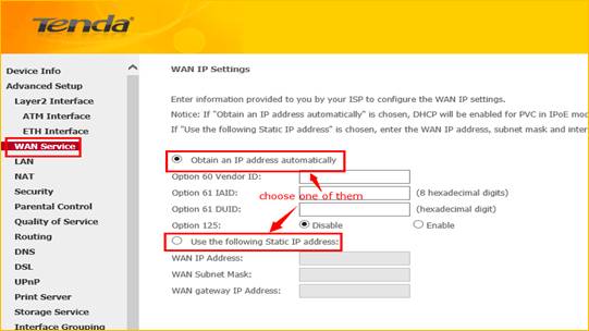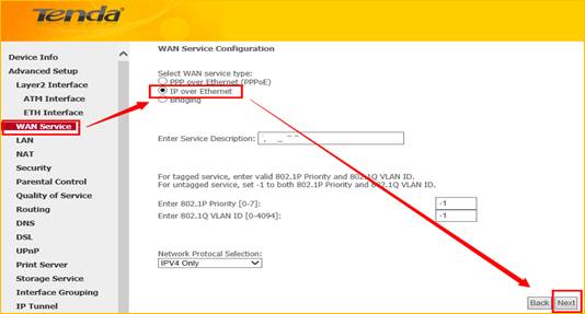 4 click WAN service-Add-Next, then choose IP over Ethernet, click Next. Then choose Obtain IP address automatically or Use the following static ip address. Click Next- Next- Next- Next-Apply/save.