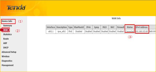 1 Click on Advanced to login the advanced setting page, then check the Device Info,if the Status shows Connected that means you can access internet, please check.