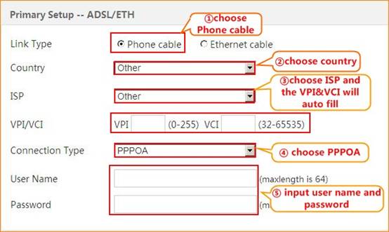 3.1.3 choose Phone cableCountry and ISP. The connection type is PPPoA and then please type in user name, password (you can consult your ISP for it if you don’t know) and OK.