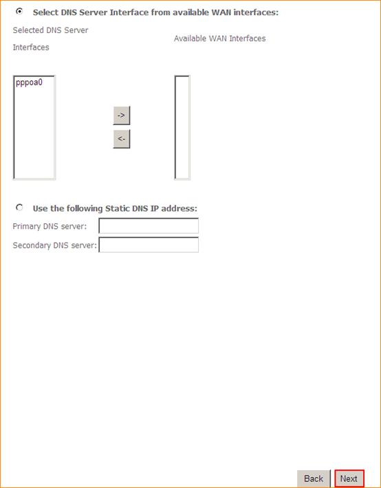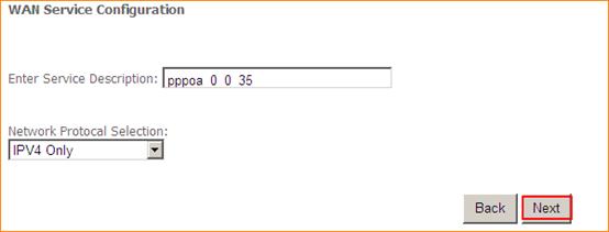3.2.3 Click WAN Service and Add, keep the atm0 and click Next, please type in user name and password (you can consult your ISP for it if you don’t know).Click Next and click Apply/Save.