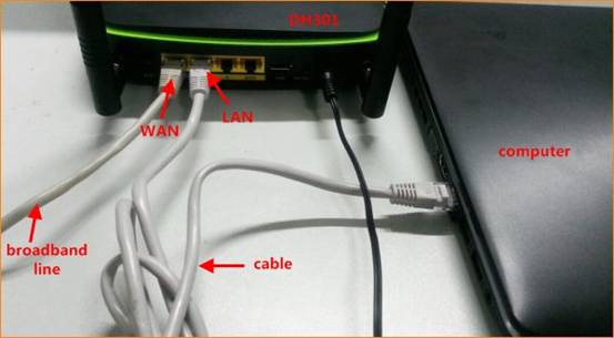Connect the broadband line with the WAN port of DH301, and then connect your computer with LAN port of DH301 by a cable.