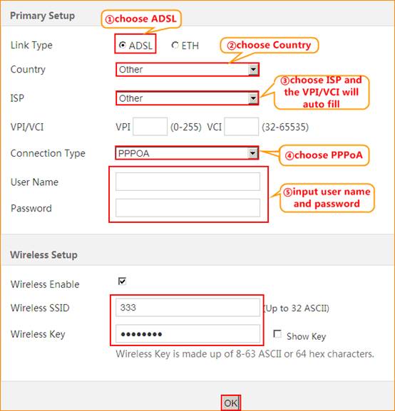 3.1.3 choose ADSLCountry and ISP. The connection type is PPPoA and then please type in user name and password (you can consult your ISP for it if you don’t know). You can also change the SSID and wireless key, and then click OK.