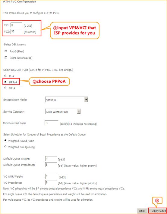 Note: If you have no idea about what is the internet connection type, VPI/VCI value, the accounts (user name and password) please call your ISP for them.